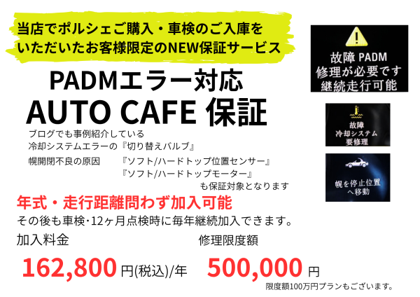 いままでPADMへの保証対応は年式と走行距離に制限があり、ちょうど起こりやすいとされる991.1や981の年式では加入が出来ませんでした。