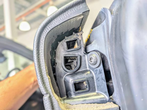 また、ドアトリムの車両後方部分もいつも通り割れています。こちらは修理した跡がありません。