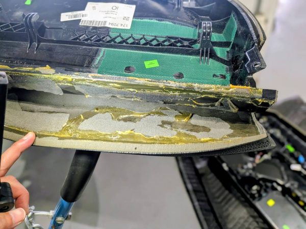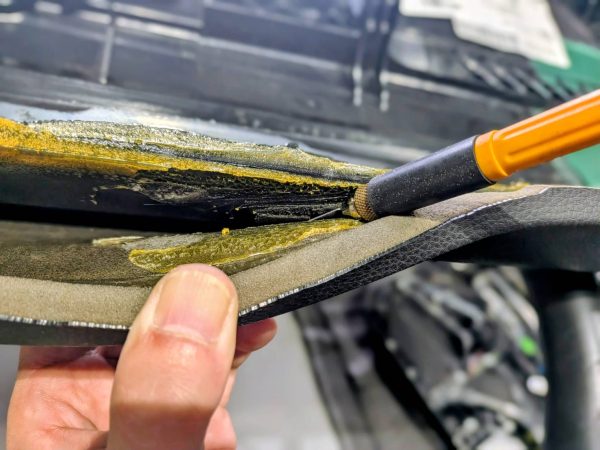 この後、トリムベースと表皮に残っている接着剤を全て除去しつつ、当店のオリジナルリペア下処理も同時進行で施工。
