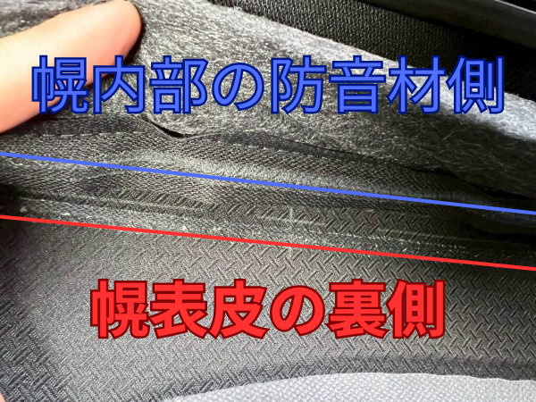 幌表皮裏側(レッドライン)と幌内部防音材側(ブルーライン)は、本来接着されています。
